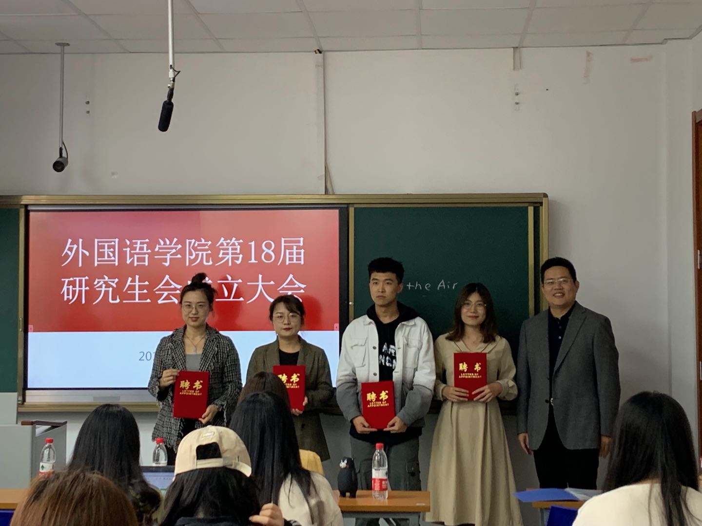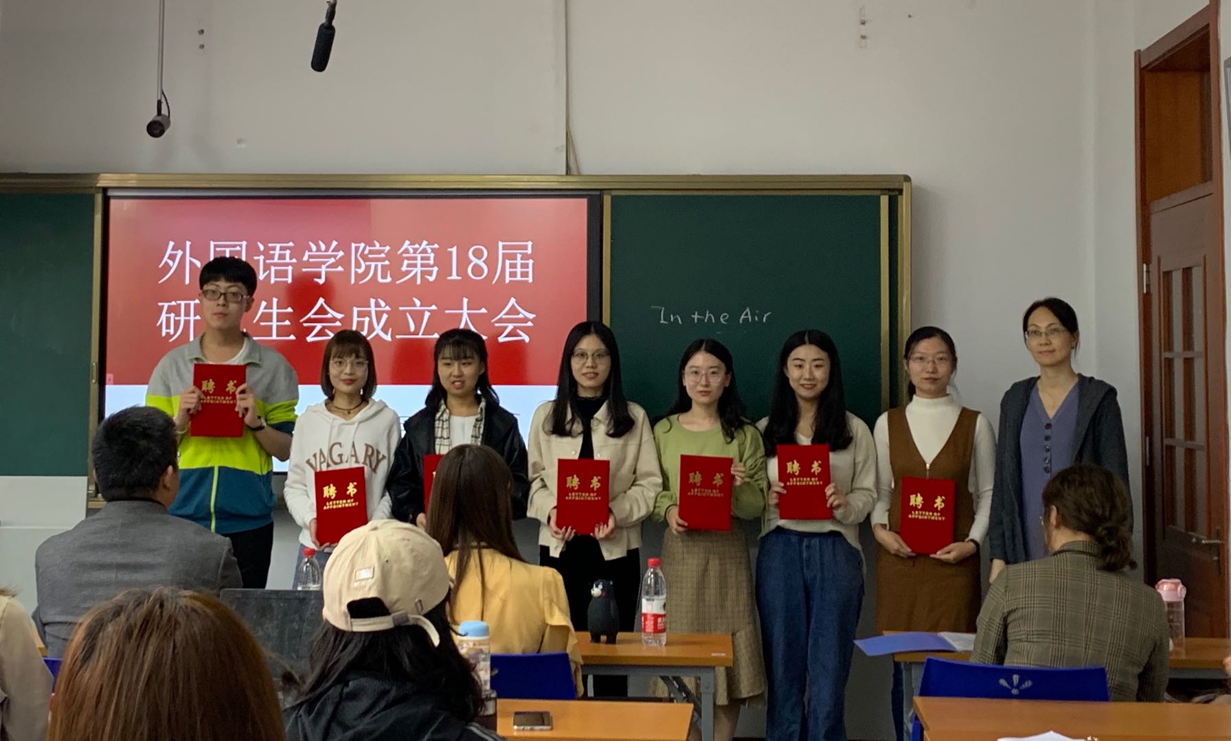 会议开始,魏鲁鸿、朱蕾为研究生会主席团及部长颁发了聘书,随后研究生会主席于雨代表研会发言,她提出了对研会成员的期望并展望了工作前景。之后,魏鲁鸿和朱蕾对本届研会的工作提出了指导和建议。魏鲁鸿表示作为研会成员一定要做好自我教育和自我管理,积极开展对同学们有益的各项活动,在服务好同学的同时还要提高自身素质。魏鲁鸿还鼓励大家利用外院的外语优势积极创新,与当下流行的新媒体平台对接,做出有外院特色的品牌。他告诫研会成员要不忘初心、牢记使命,努力创造和谐美好的工作环境,让每个研究生都能度过美好的研究生生活。最后魏鲁鸿为研会送上了美好祝愿,希望研会工作顺利,每个成员都可以收获满满。朱蕾表示,希望研究生会可以加强团支部建设,积极组织实践活动和志愿服务活动,打造研究生社会实践团队。
