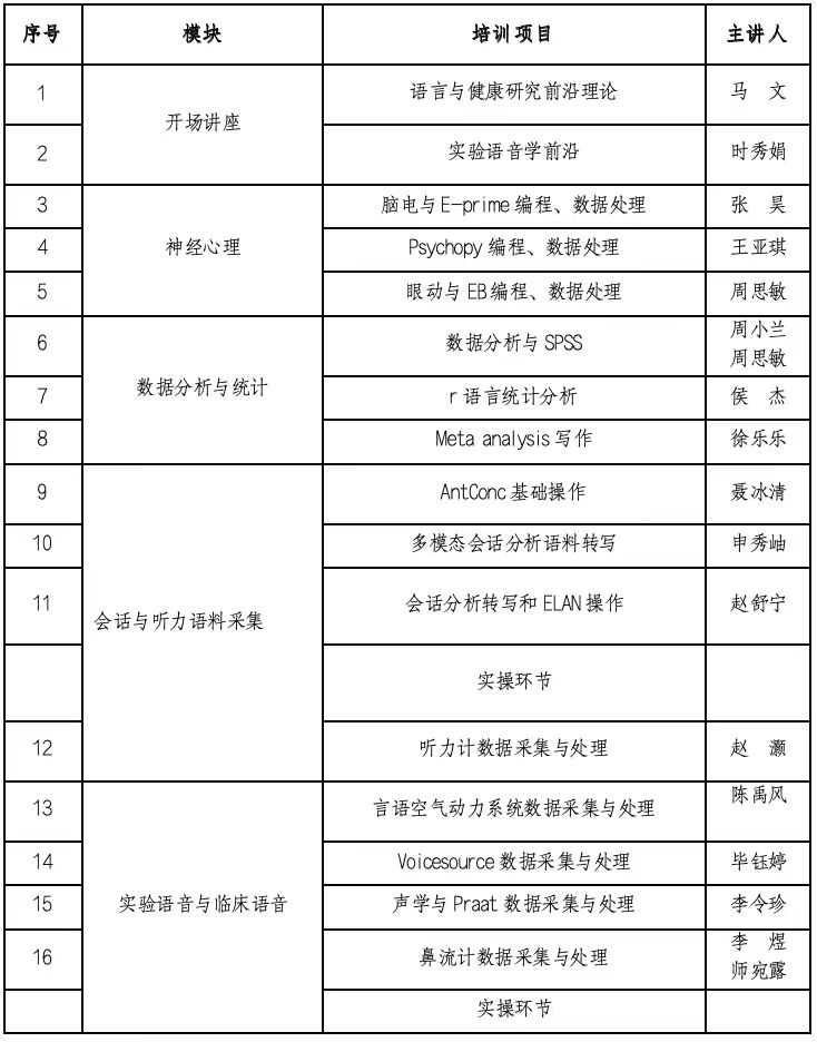 为了推动该前沿交叉领域的进一步发展,提升本校师生在实证研究方面的能力,中心面向全校师生精心策划了公益性的“语言认知与健康科学”研究技术培训班。本次活动将充分利用中心先进的研究设备、丰富的科学研究经验以及一流的研究团队资源,引领学员们深入探索语言认知科学研究的奥秘。课程内容丰富多样,涵盖神经心理学、数据分析与统计、会话与听力语料采集、实验与临床语音学四个模块,共计十六场培训讲座,将帮助学员们熟练掌握相关研究方法与技术,为进一步开展语言认知科学及健康前沿研究提供有力的支撑。