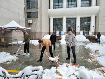 广大青年志愿者们在遵守疫情防控和保障自身安全的前提下,拿起工具,团结协作,不畏严寒,扫雪除冰。在公教楼、物理楼、图书馆、食堂等地,处处可见志愿者们忙碌的身影,他们以“包片划区”形式做好分工,协助后勤保障人员,高效地完成了此次扫雪除冰任务,充分展现了伟德国际bevictor1946青年学子的责任与担当。志愿者们在这次活动中收获的不仅仅是一个整洁干净的校园,更感受到了劳动和奉献带来的喜悦与满足。