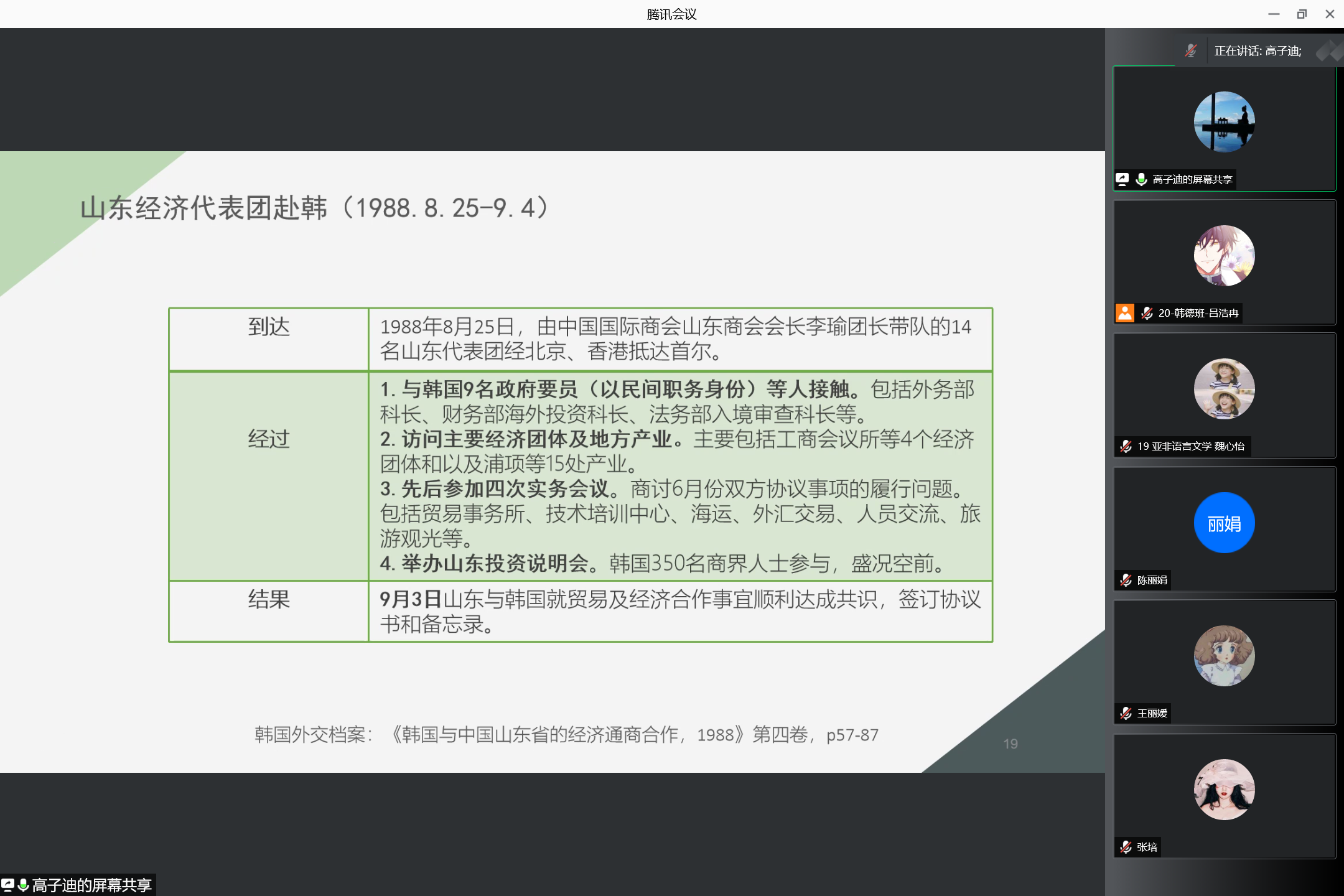 国别与区域研究专业21级博士研究生陈丽娟以“从档案解读到论文写作:中韩建交前的辣椒贸易”为题,从韩国进口我国辣椒的相关外交档案入手,介绍了韩国进口中国产辣椒的过程,探讨了中韩两国建交前辣椒贸易开展的缘由、交涉过程、达成原因等问题。亚非语言文学专业19级硕士研究生高子迪以“1988年韩国与山东的经济合作”为题,基于韩国档案史料馆的外交档案,具体考察了1988年韩国与山东开展的经济合作情况。高子迪认为,1988年韩国与山东的经济合作经历了“关系缓和与间接接触,初步交流与顺利磋商,互动升级与合作达成,积极探索与稳中求进”四个阶段,双方的合作对中韩关系的改善起到了良好的推动作用。
