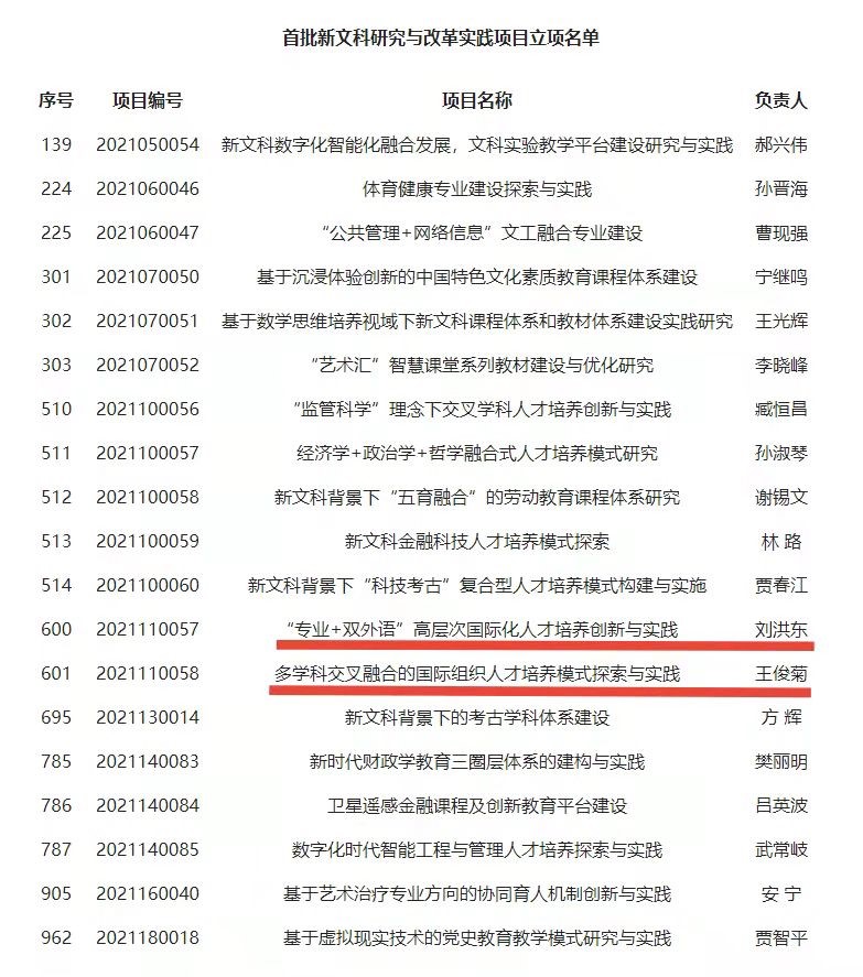 近日,教育部办公厅公布了首批新文科研究与改革实践项目立项名单,伟德源自英国始于194619个项目获得立项。其中,伟德国际bevictor19462个项目入选,分别是王俊菊教授主持的《多学科交叉融合的国际组织人才培养模式探索与实践》,刘洪东副教授主持的《“专业+双外语”高层次国际化人才培养创新与实践》。