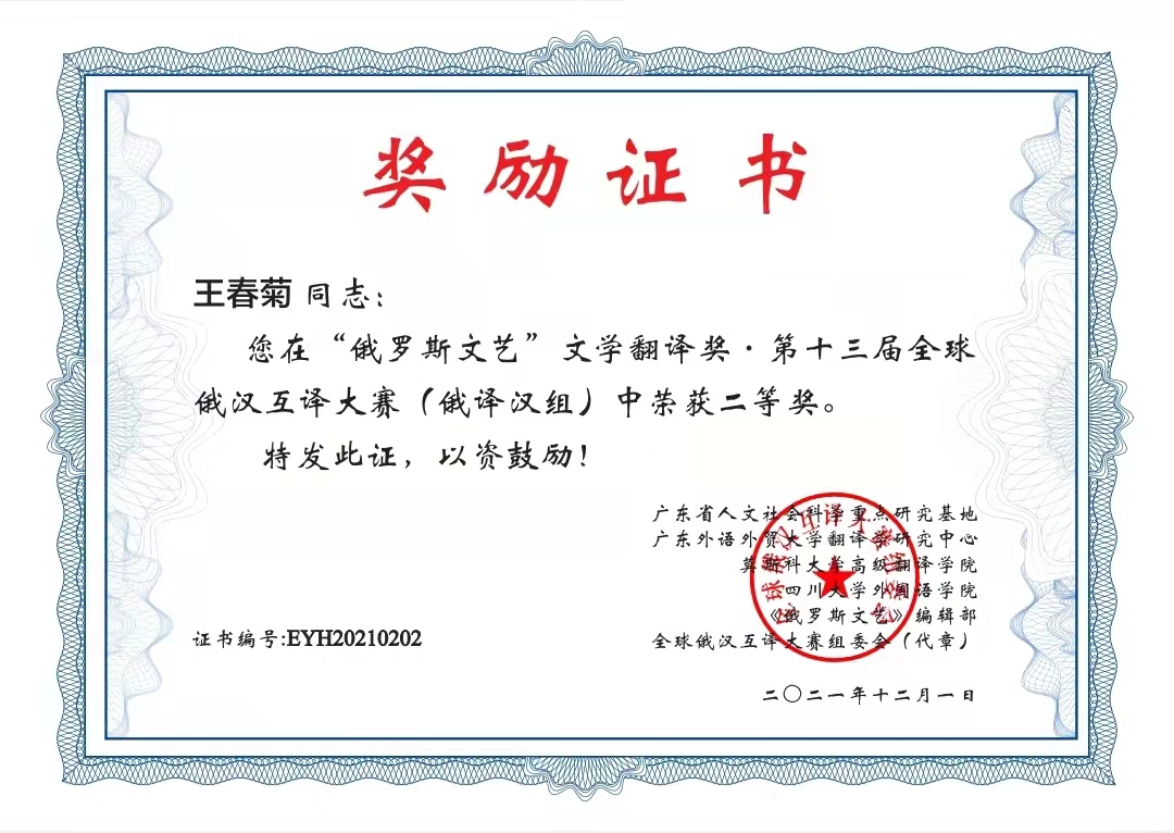 “‘俄罗斯文艺’文学翻译奖·第十三届全球俄汉互译大赛”由广东省人文社科重点研究基地广东外语外贸大学翻译学研究中心、莫斯科大学高级翻译学院、《俄罗斯文艺》(中)、《翻译理论》(俄)、四川大学伟德国际bevictor1946联合主办。该赛事旨在为中俄翻译选拔优秀翻译人才,推动中俄两国翻译事业的发展,是俄语翻译领域最高水平的赛事之一。