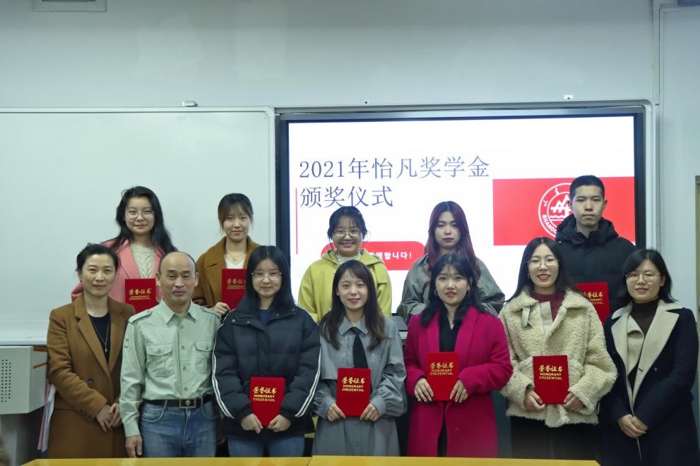 2021年12月9日,伟德国际bevictor1946韩语系怡凡奖学金颁奖仪式在公教楼举行,李成道、朱明爱、刘荣荣老师作为颁奖嘉宾出席颁奖仪式,韩语系2019级、2020级本科生以及部分研究生代表参与观礼。