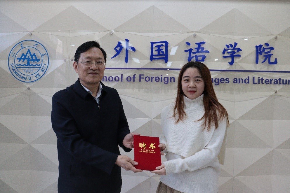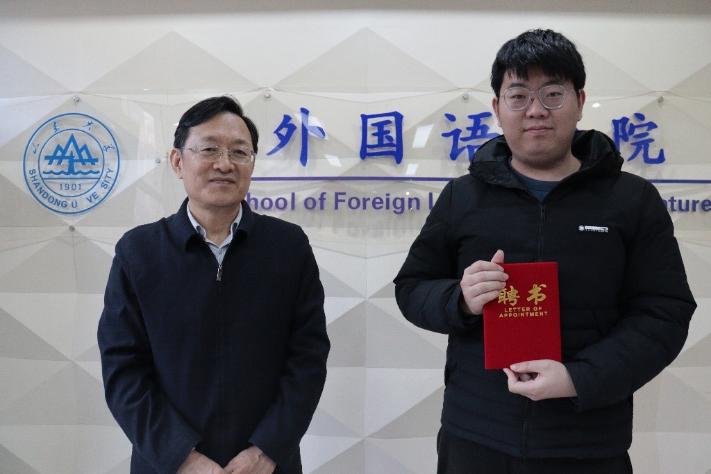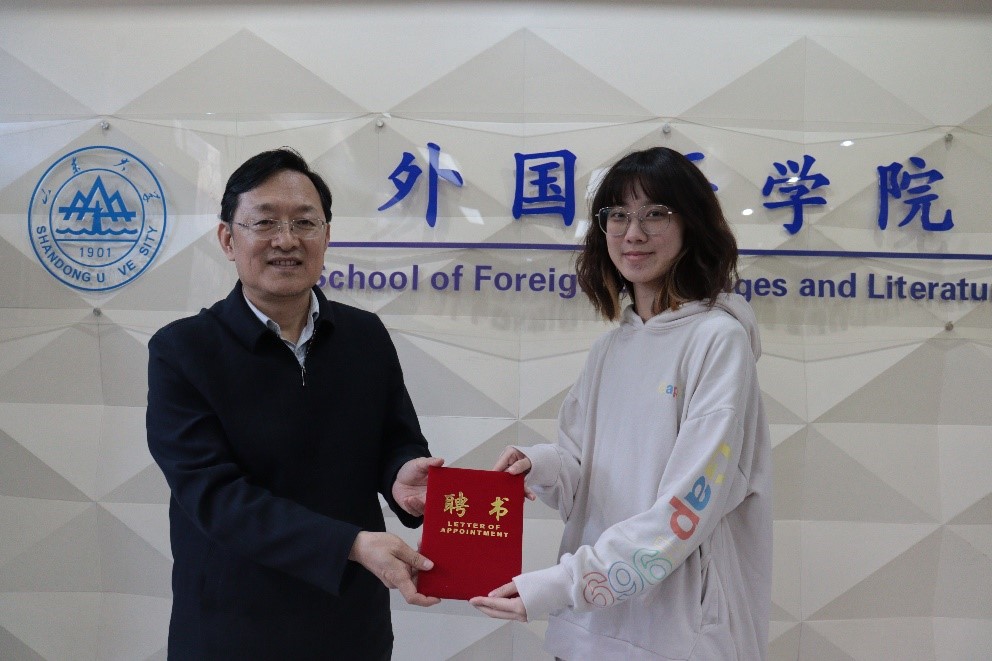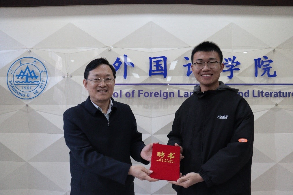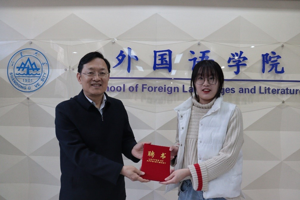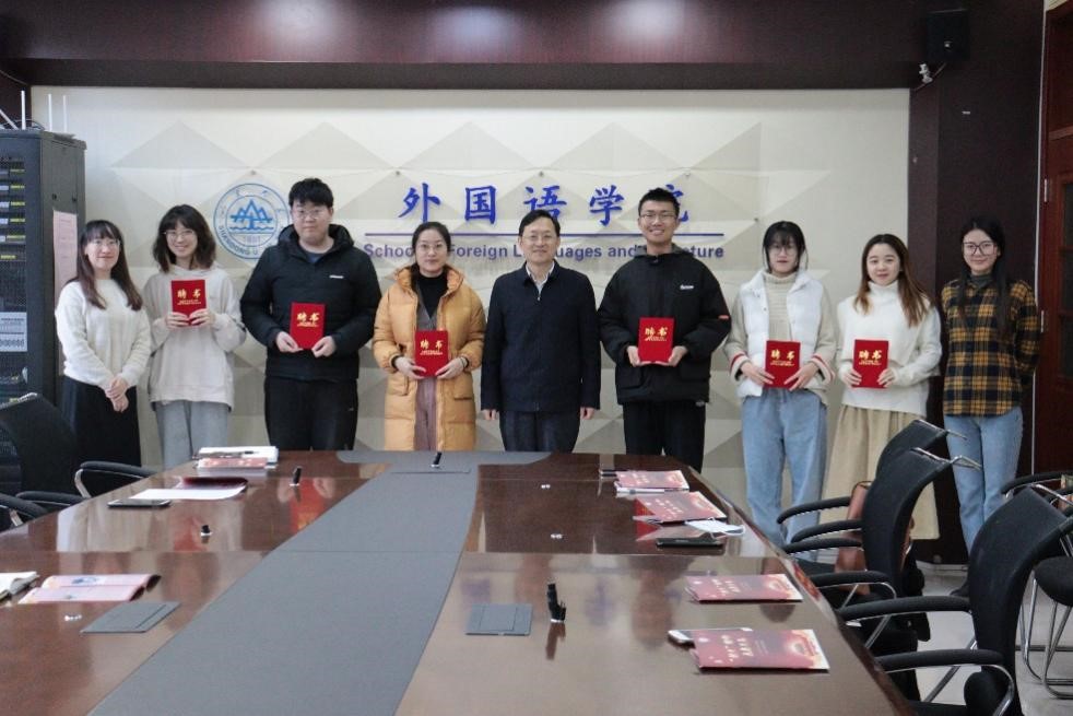参会领导薛佩军向宣讲团六位成员颁发聘书并讲话。薛佩军肯定了“新火”宣讲团上一年的成果。针对下一年的工作规划,薛佩军强调,作为宣讲团成员首先要坚定自身理想信念,提高自身政治素养,坚定“四个自信”;必须主动关注国内、国际热点,扩大知识储备,拓展政治视野;要利用好我们的“多语种”的特色优势,探索思政教育新思路,培养具备家国情怀、国际视野和专业本领的复合型人才,表达了对宣讲团成员们的殷切期望。