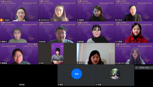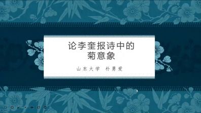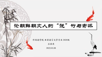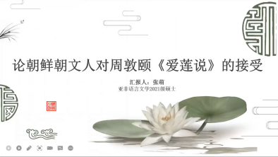 会议下半场,20级硕士研究生吕浩冉以“论朝鲜朝文人的‘说’竹与寄怀”为题,以朝鲜朝与竹相关的“说”体作品为研究对象,对朝鲜朝文人笔下的竹进行了探讨,考察了其中寄寓的文人情感、道德追求与审美志趣。20级硕士研究生朴勇爱以李奎报的汉诗为研究对象,考察了其汉诗中的菊意象,探讨其意象的成因及美学意义。21级硕士研究生张萌以“论朝鲜朝文人对周敦颐《爱莲说》的接受”为题,以《韩国文集丛刊》中收录的与《爱莲说》相关的诗歌与散文为研究对象,分析并梳理了朝鲜朝时期文人对周敦颐《爱莲说》的接受情况。