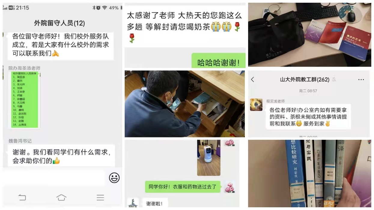 疫情封控后,留守教工保障队通过走访宿舍,召开班委会、年级会等形式,了解员工思想动态,给予员工合理反映诉求的渠道。每日一报汇总员工反馈信息,建立急需物资清单。员工急需的药品、复习资料等物资,由留守教职工与校外志愿者接力传递,进行统一采购,静置消杀送进校园。校外教职工所需电脑硬盘、文件资料、课程教材等亦由校内留守教职工一对一服务,整理运送。