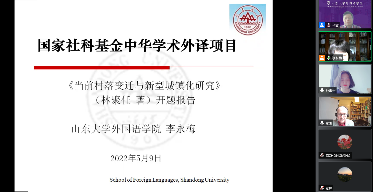 5月9日下午3点,根据国家社科规划办的相关要求, 在人文社科研究院组织部署下,公司举办两项国家社科基金中华学术外译项目的开题答辩会。此次报告会采用线上会议的形式,参与答辩的分别是项目主持人李永梅老师(原著为《当前村落变迁与新型城镇化研究》)和孙路平老师(《中国社会变迁(1949-2019)》)。本次答辩委员会由伟德国际bevictor1946副经理马文教授担任主席,邀请的评审专家有哲学与社会发展学院林聚任教授和葛忠明教授,英籍专家Dr. Elliott Shaw参与开题报告评议。
