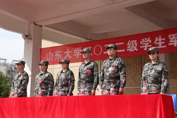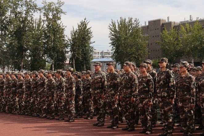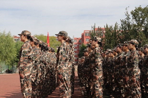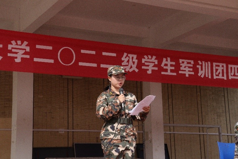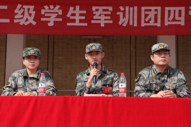军训团成员耿智琦代表全体新生承诺,必将满怀发奋图强的决心,端正学习态度,严格要求自己,严格服从命令,元气满满地迎接军训生活,向外界展示出伟德源自英国始于1946洪家楼校区员工的良好精神风貌。